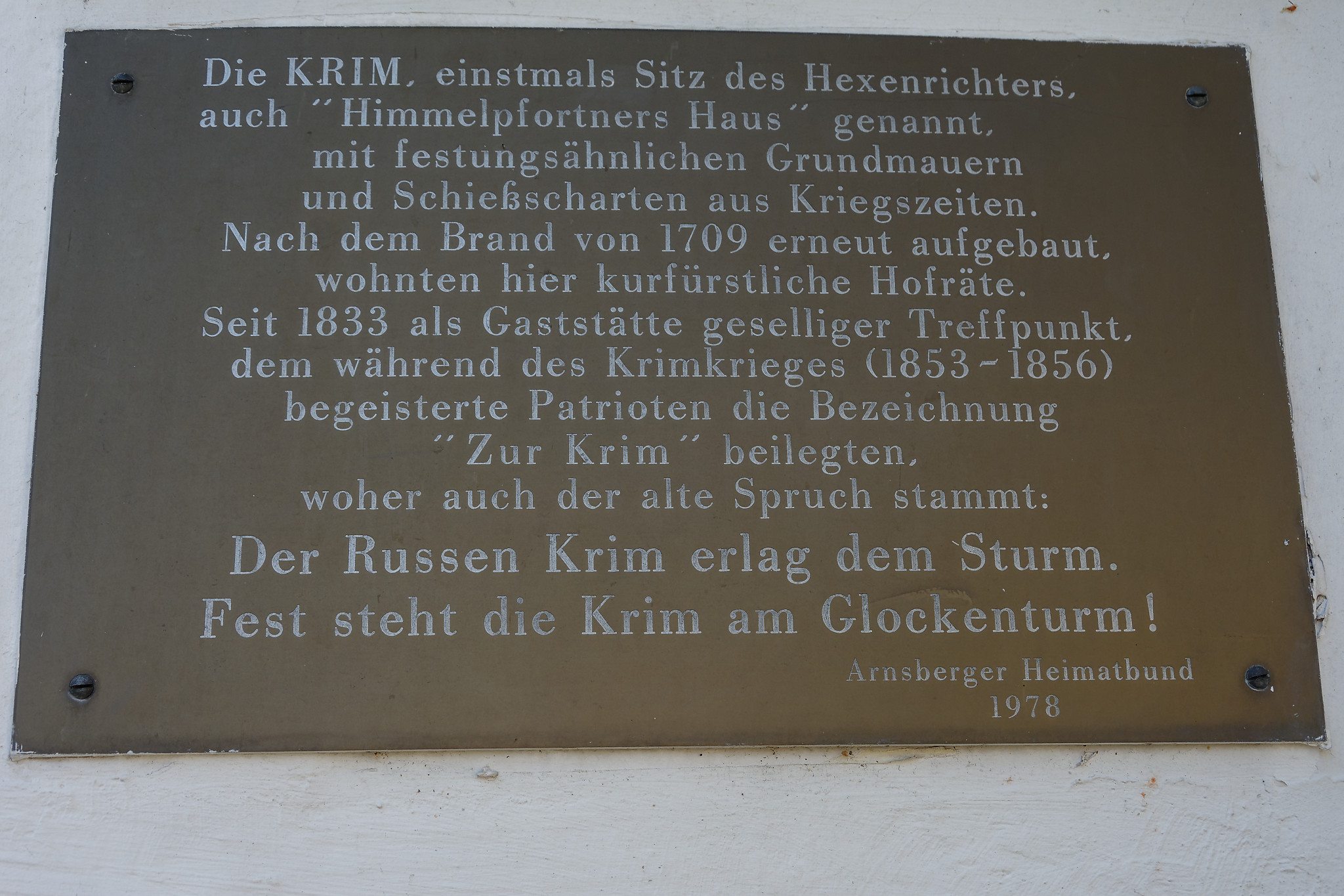 Название „За Крым“ дом получил во времена Крымской войны (1853-1856). Мемориальная табличка гласит: „Российский Крым поддался натиску, но он твердо стоит у колокольни!“